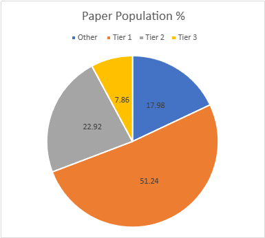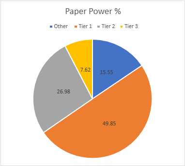 Then we go one standard deviation (STdev) above average to set the limit of Tier 3 and the cutoff for Tier 2. This mathematically defines Tier 3 as those decks clustered near the average. Tier 2 goes from the cutoff to the next standard deviation. These are decks that perform well above average. Tier 1 consists of those decks at least two standard deviations above the mean result, encompassing the truly exceptional performing decks.