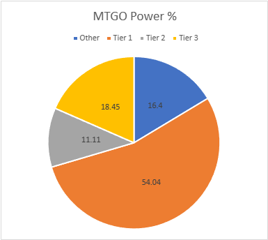 Daybreak is now releasing the total results from every MTGO Preliminary and Challenge. After some experimentation, I'm sticking to just using the Challenge Top 32 results and 3-1 or better from the Preliminaries. The first reason is that, ultimately, nothing changed. The population metagame list didn't change between my normal method and the experimental versions. Various treatments for the power metagame did change the order of the tier list, but the composition varied only marginally.