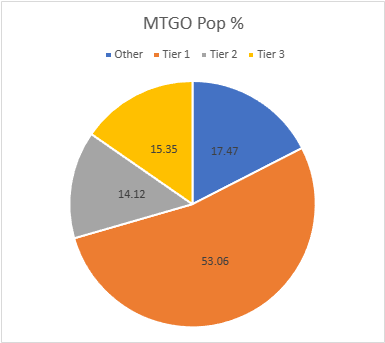 February's average population for MTGO was 13.92, setting the Tier 3 cutoff at 14 decks. I always round down if the decimal is less than .20. Tier 3, therefore, begins with decks posting 14 results. The STdev was 27.05, so add 27 and that means Tier 3 runs to 41 results. Again, it's the starting point to the cutoff, then the next whole number for the next Tier. Therefore Tier 2 starts with 42 results and runs to 69. Subsequently, to make Tier 1, 70 decks are required.