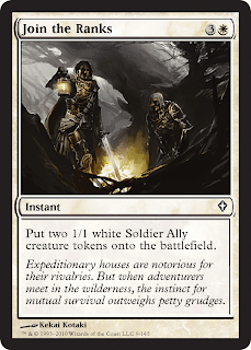 Join the Ranks: This card used to cost 1W when it was in Mirrodin, but by giving the creatures an Ally subtype has serious implications in Limited. It's probably too slow for Constructed, although the milling Ally will pair naturally with Join the Ranks and Hedron Crab. In Limited, it's a combat trick with potential for good synergy. It gives the Ally draft decks something to look forward to in pack 3.