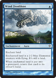 Wind Zendikon: I had been discussing the interactions with Fetch Lands with a few people via AIM and Twitter and our main thought was "wouldn't it be nice if there was a 1-cost Zendikon"? This allows aggressive decks to get multiple Landfalls in a turn easily by turning a fetch land into a 2/2 flier. Sacrificing the fetch land, recurring it with Wind Zendikon, and replaying it gives decks access to 3 Landfall triggers in a turn. The potential is endless, and at worst, this card is a 2/2 flier for 1U. Might not have a home in Standard, but should be a high draft pick and has a ridiculous amount of synergy.