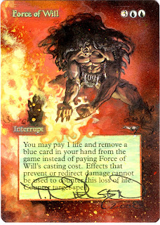 When I began building the deck, I was fortunate enough to have a friend that was looking to sell his collection. I picked up Force of Wills, Tarmogoyfs, as well as several out-of-print un/commons from him for a disgustingly cheap price. I was also able to find $1+ commons, in the commons bin at my local card store for $.10/each. If your local shop has a un/commons bin, it is worth the 15 minutes to rummage through for cards such as Brainstorm, Ponder, Daze, and Lightning Bolt. In the weeks following, I checked eBay, my brother's collection (Sorry Joe), and the backs of binders at FNM to complete my deck. Often times you'll find non-Eternal players more than willing to trade their "old cards" for Standard goodies. Do that. Do that often. 2 Day of Judgements and a Meddling Mage is much easier to acquire than a mint FoW.