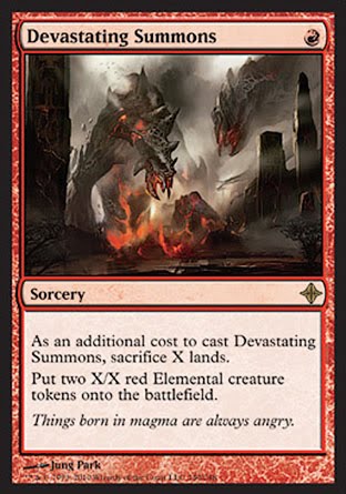 Hey,Initially I thought Devastating Summons would be a bad card too, mainly because of the lack of numbers. But if you crunch the numbers with Goblin Bushwacker, you can start swinging for 10 on turn 3, 12 on Turn 4, and so on. Good monored decks shouldn't have a late game, so the land loss factor is moot. Plus, red has some great burn (Lightning Bolt, Burst Lightning, etc.) in Standard today.I think that the only thing that will limit this card's price is the niche it has. Right now I don't think there's much use for this card outside RDW/Boros decks. If RDW and Boros become a contender in the Standard metagame, I'd say this card maxes out to around $4-5.