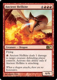 First against the wall is Ancient Hellkite, an over-costed and underwhelming fattie that has, in all likelihood, already won someone a game or three of Sealed Deck. He's a classic Timmy Dragon; unbeatable if left unchecked in Limited and totally Irrelevant for constructed. Obviously trade these for whatever you possibly can.