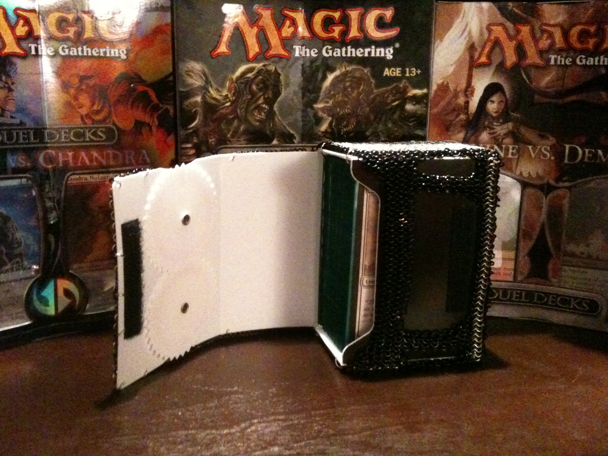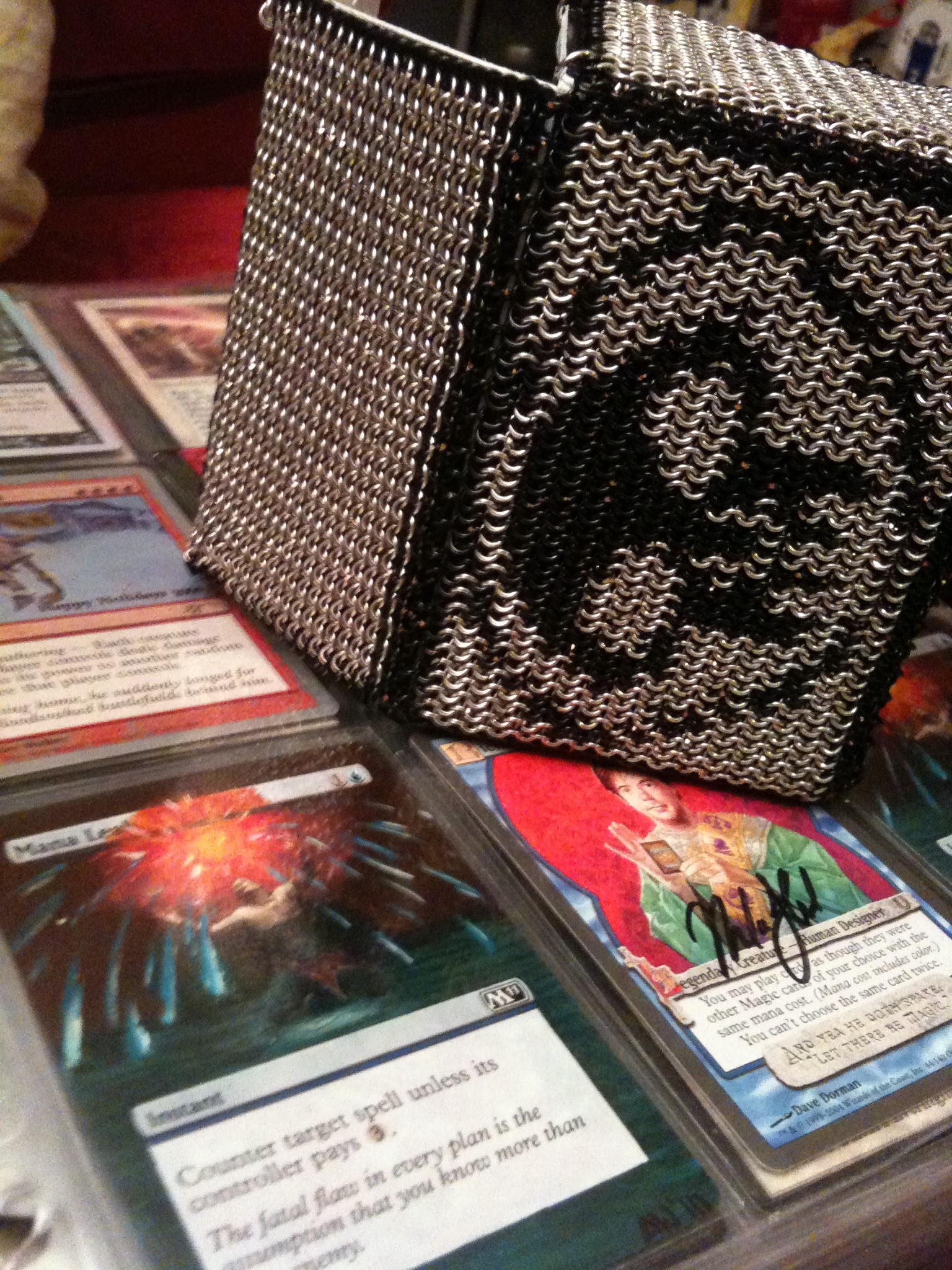If you’d like a one of a kind deck box (or something else) she is taking commissions if you can toss her $250 and six months to do it. She can build (smith?) in just about any 30x40 pixel design and in all the good colors (red, yellow, green, blue, purple, black, silver, gold, and copper) and can be reached at gypsymoon_chainmail@hotmail.com.