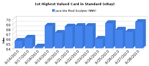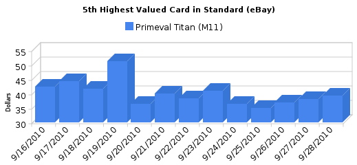 There is a lot to scroll through on this one. Jace, the Mind Sculptor is still on top, but the last weeks prerelease prices on eBay have shoved Primeval Titan down to 5th from its customary place of 2nd. This gap is filled with the likes of the Mox Opal, Koth, of the Hammer, and Venser, the Sojourner. Though three of the top four spots going to Planeswalkers is hardly surprising, I would say that they probably won’t all be there or in this order in a couple week. Scars of Mirrodin is trending very high right now in overall value and it can’t keep it up due to some of the more basic tenants of supply and demand. As you can see if you scroll far enough, along with what you have already come to know (and love) in the Demand Matrix covering Standard I’ve gone ahead and added in a Matrix for both the Extended format and for the combined Legacy and Vintage formats (renamed “Eternal” based on comment feedback). Immediately following the writing of that last sentence I became curious and created a list of all the Magic card as well to show how the cards in every format compare against each other. That list is embedded a little lower on the page but before we get to that I’d like to draw your attention to the extended list. Baneslayer Angel tops it out (the M10 version) and although I could spend some time to filter cards printed in Standard out, I decided to leave them in. The M10 version has been trending below that of the M11 version for months now anyway, and it is a valid card for Extended. You might also have noticed that I rotated the sets a few days ahead of their actual rotation. With Elspeth, Knight-Errant taking the number two slot, Ignoble Hierarch in third, and on down to the M10 version of Garruk Wildspeaker in 10th, there are only two cards in the top ten of the Extended list that are of older cardboard.