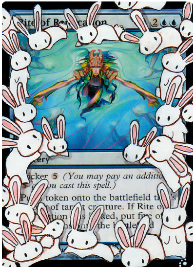 I do think that some of the other alters offer a better chance to trade away though in some cases. Take, for example, the Rite of Replication alter shown in the article. I could easily trade this to a casual player whose goal is to kick a Rite on the most humorous creature available at the time. The explosion of bunnies just adds to the humor of the situation and that may give the card some more value to them. If the alter was just an extension of the original art they might like the card but they probably wouldn't want to trade for it at a premium.