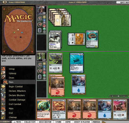 I Shatterthe Shield before combat and take two damage and a poison when my opponent attacks with the Glint Hawk and Necropede, going to 11 life. On my turn I draw an Auriok Replica, cast and equip the Barbed Battlegear, and attack for eight with the Drake and the two Myr. He declines to block with his Gold Myr and goes to 12 life.