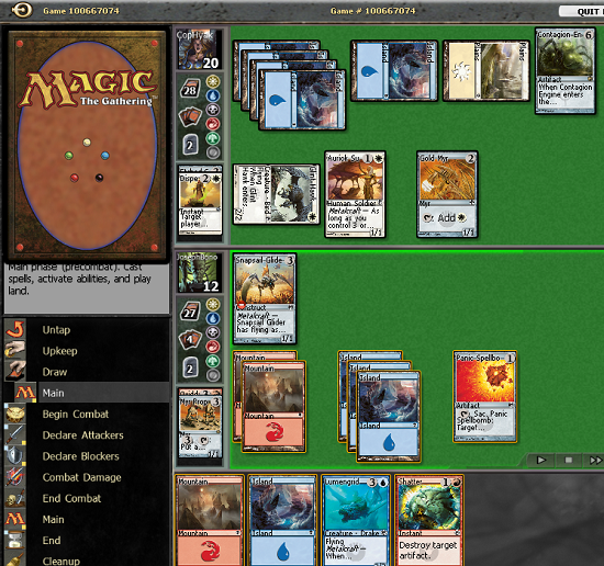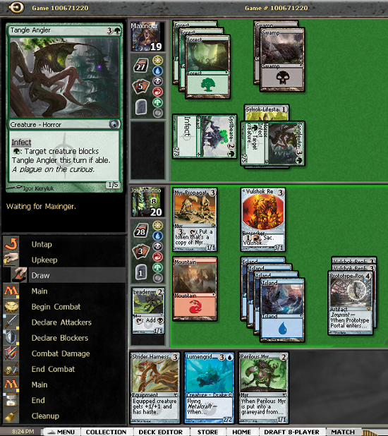 My choices are to use Lumengrid Drake to bounce his Tangle Angler or to play the Perilous Myr and make a Vulshok Replica with the Portal. Bouncing the Tangle Angler is a much better play, since the other plan loses to any removal spell or to my opponent ripping a fourth Forest. I cast the Drake and bounce the Angler, but then I inexplicably attack with the Propagator. At the end of my turn my opponent casts Carrion Call to get two more Infect creatures then untaps, casts Skinrenderto kill one of my blockers, and attacks for lethal.