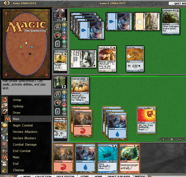 Instead I shattered the Contagion Engine and cast the Lumengrid Drake. This play is pretty bad, as the Contagion Engine is almost useless at this point. My opponent probably doesn’t have anything that he can profitably proliferate, so the only thing shattering it accomplishes is saving the Snapsail Glider, which isn’t worth wasting a removal spell.