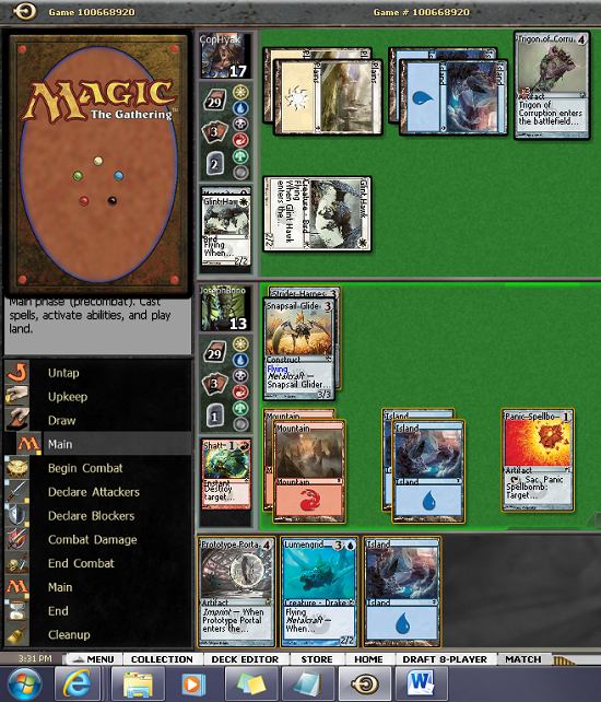 The right play here is to attack with the Snapsail Glider, cast the Lumengrid Drake, play a Mountain, and pass the turn, intending on trading the drake for his Glint Hawk, breaking the Panic Spellbomb at the end of his turn (I haven’t broken it before this because I wanted to hit metalcraft, but the extra card is more relevant given that I won’t hit metalcraft anytime soon), and having him proliferate away my Snapsail Glider during my turn. Doing this wastes his mana, gets the biggest threat off the table, and gives me two draw steps to find a creature to hold the ground.