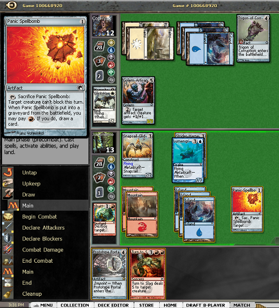 My opponent attacks with his Vedalken Certarch, Gold Myr, and Auriok Sunchaser, and I trade the Snapsail Glider for the Certarch, going to 10 life. He passes the turn and I cycle the Panic Spellbomb at end of turn drawing Flight Spellbomb. On my turn I draw a Mountain, cast the Portal, imprinting the Flight Spellbomb, and play a Mountain. I should immediately use the Portal to make a Spellbomb and cycle it in case I draw a two drop, but instead I pass the turn.