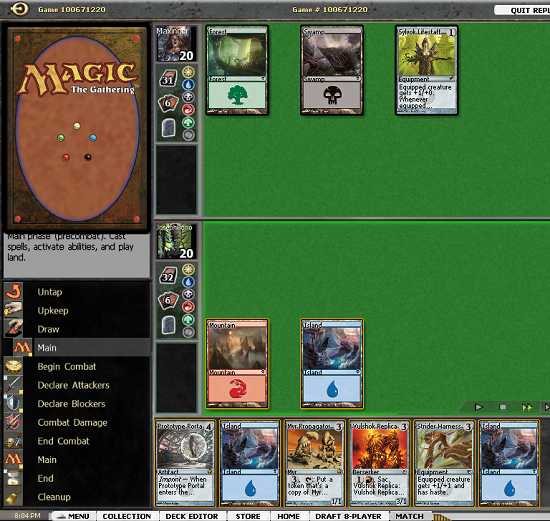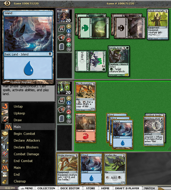 My opponent is probably playing Infect – both Myr Propagator and Prototype Portal are going to be pretty useful in this matchup, as long as I get enough time to activate them. I play an Island, cast the Myr Propagator, and pass the turn, planning on imprinting the Vulshok Replica on the Prototype Portal next turn. He plays a Forest and casts a Cystbearer, which is what I would expect given that he didn’t have a two drop.
