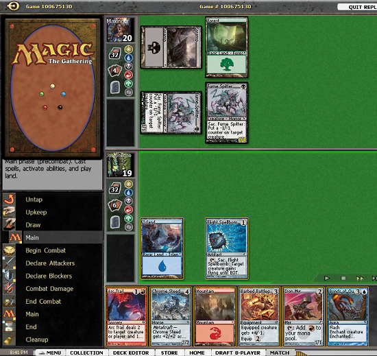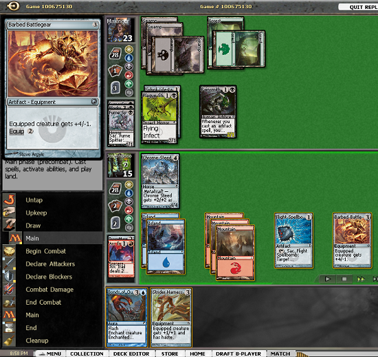 As expected he Fume Spitters my Myr, but then he plays a swamp and casts and equips a Sylvok Lifestaff to attack for 2. On my turn I draw an Island, play it, cast the Barbed Battlegear, and ship the turn. I don’t crack the Spellbomb here as I would like to give myself the chance to eventually get a Metalcrafted Chrome Steed, and I don’t intend on casting either of my four drops next turn.