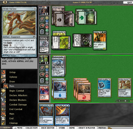 My opponent plays a Painsmithand passes the turn. This seems like a missed opportunity on his part. If he attacks with the Plague Stinger I will have to trade my Chrome Steed to block it, since I’ll lose Metalcraft if I use the Flight Spellbomb. Unless he already has an answer to the Spellbomb or the Chrome Steed this seems like a fine trade for him. Additionally, I might choose not to block at all, which gets him two free poison counters. Regardless, I take the turn back, draw a Strider Harness, and try to figure out my game plan: