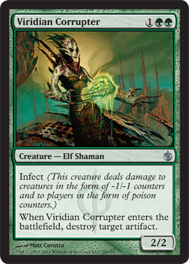 Viridian Corrupter: In a kind of ghastly mirror reflection, Viridian Shaman has been twisted to create an infect variant with no less utility than before. In a format where 2/2s don’t do much to kill creatures or knock down life totals, the infect ability makes the Corrupter vastly superior to its untainted counterpart, in that even as a bear it becomes a 5-turn clock.