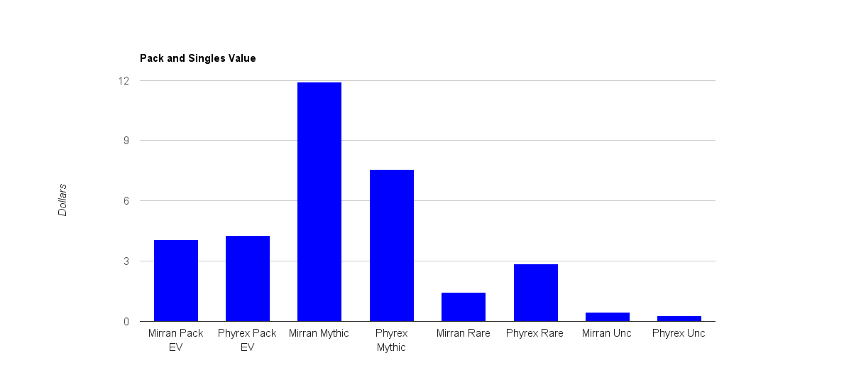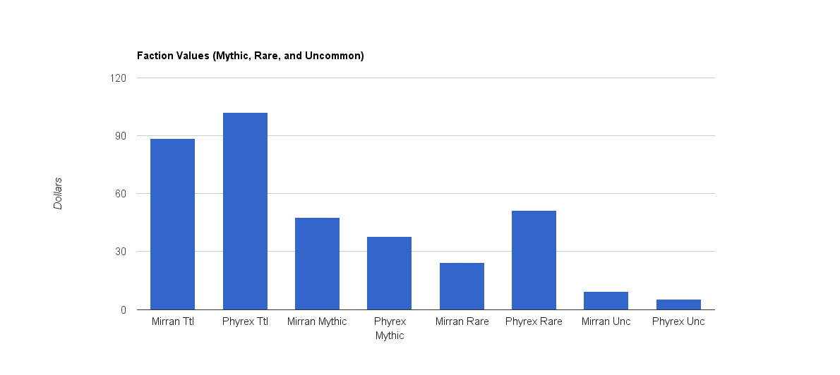 As you can see above, the Pyrexian total value is higher, but they also have one more Mythic, and one more Rare. The Mirran Mythics total more than Phyrexian even with fewer cards. The Phyrexian Rare total is higher then Mirran by a good amount and with Rares being easier to come by than Mythic, Phyrexia might just win the value battle. We'll need to weight those numbers though against general pack rarity distribution figures.