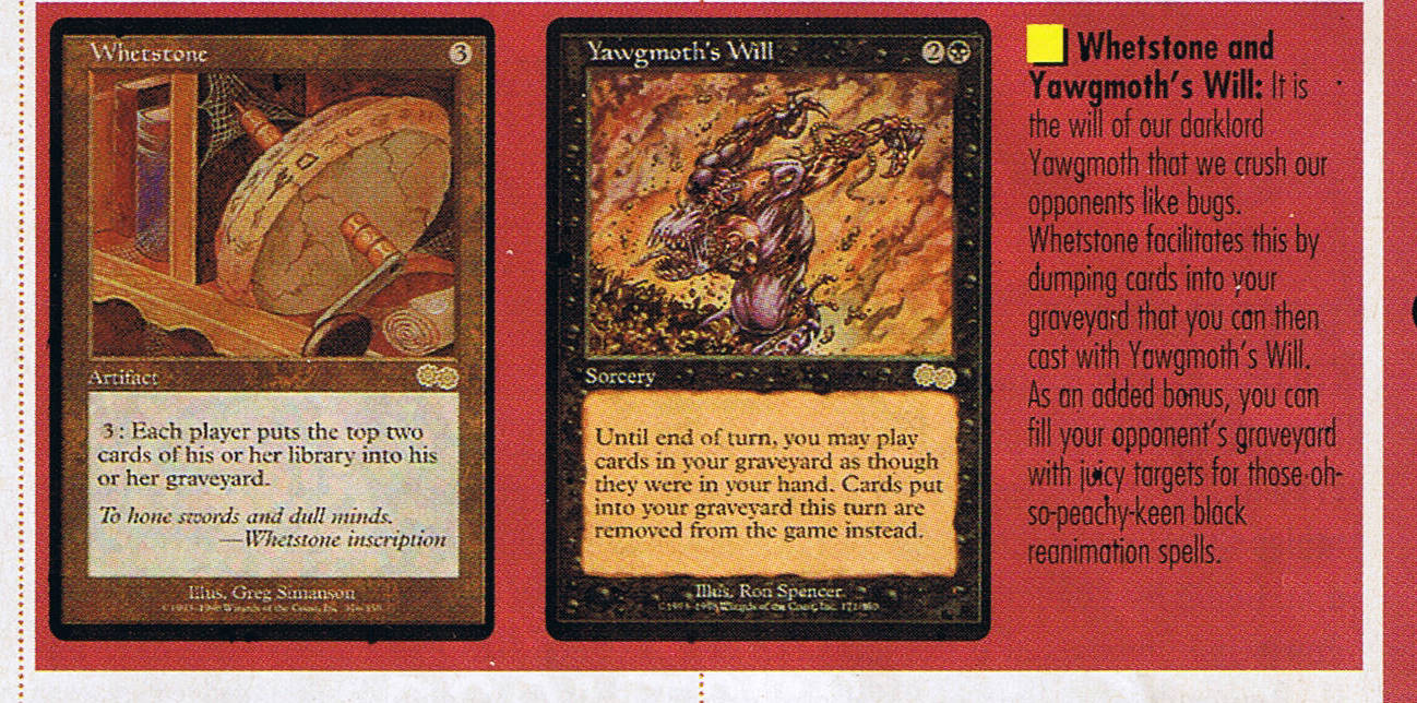 This was heralded as an improved Braingeyser when it first came out. It was an exciting card when combined with Grim Monolith and could potentially refuel your hand at the end of the opponent's turn. Stroke had immediate play in Academy decks, both as a draw card and kill mechanism to deck the opponent. For a long time, it was restricted in Vintage for power reasons. These days, you can pack four copies. It also has a good deal of appeal in casual formats, since you can hit whoever you want with it and you don't have to risk tapping out on your own turn.