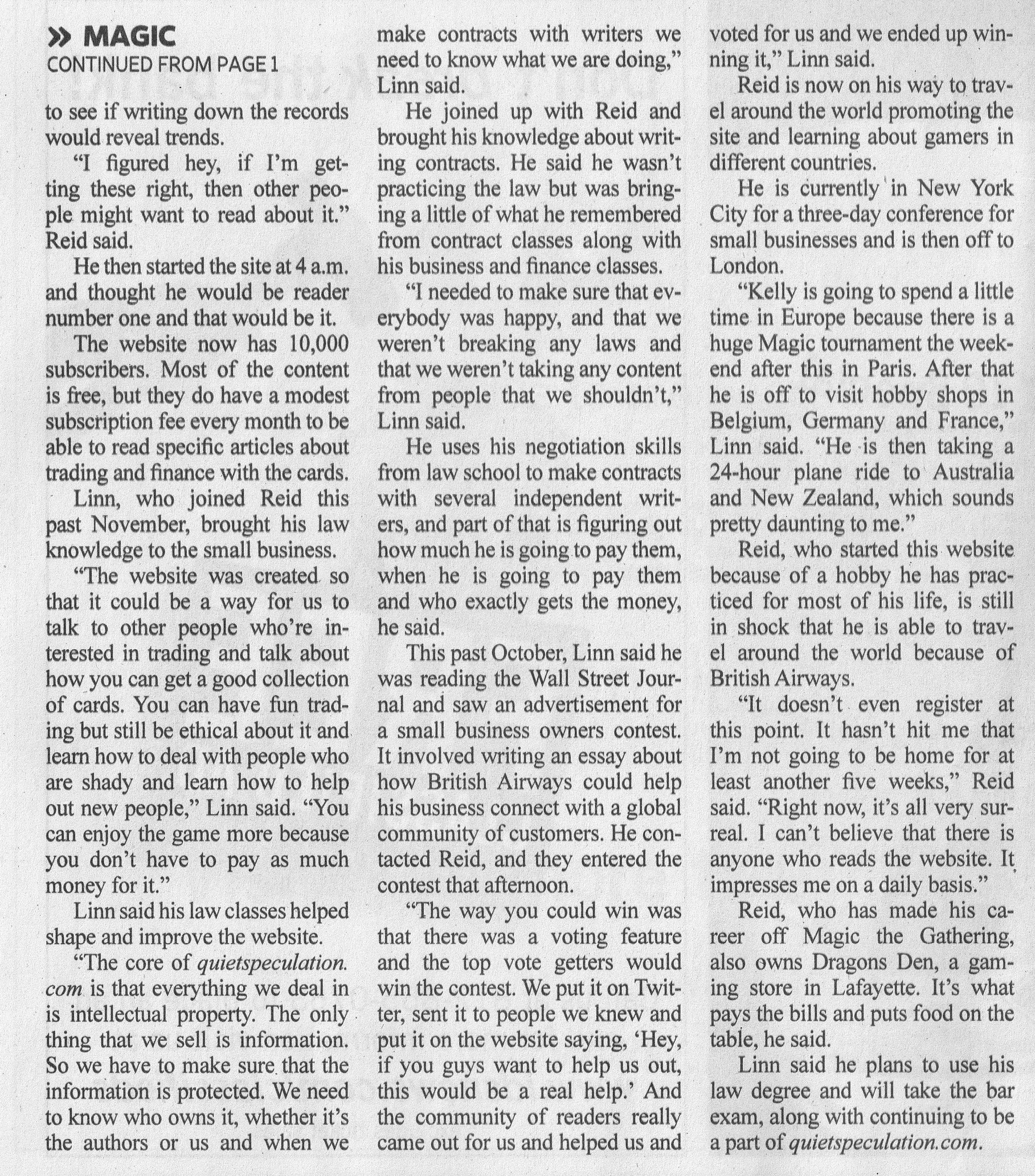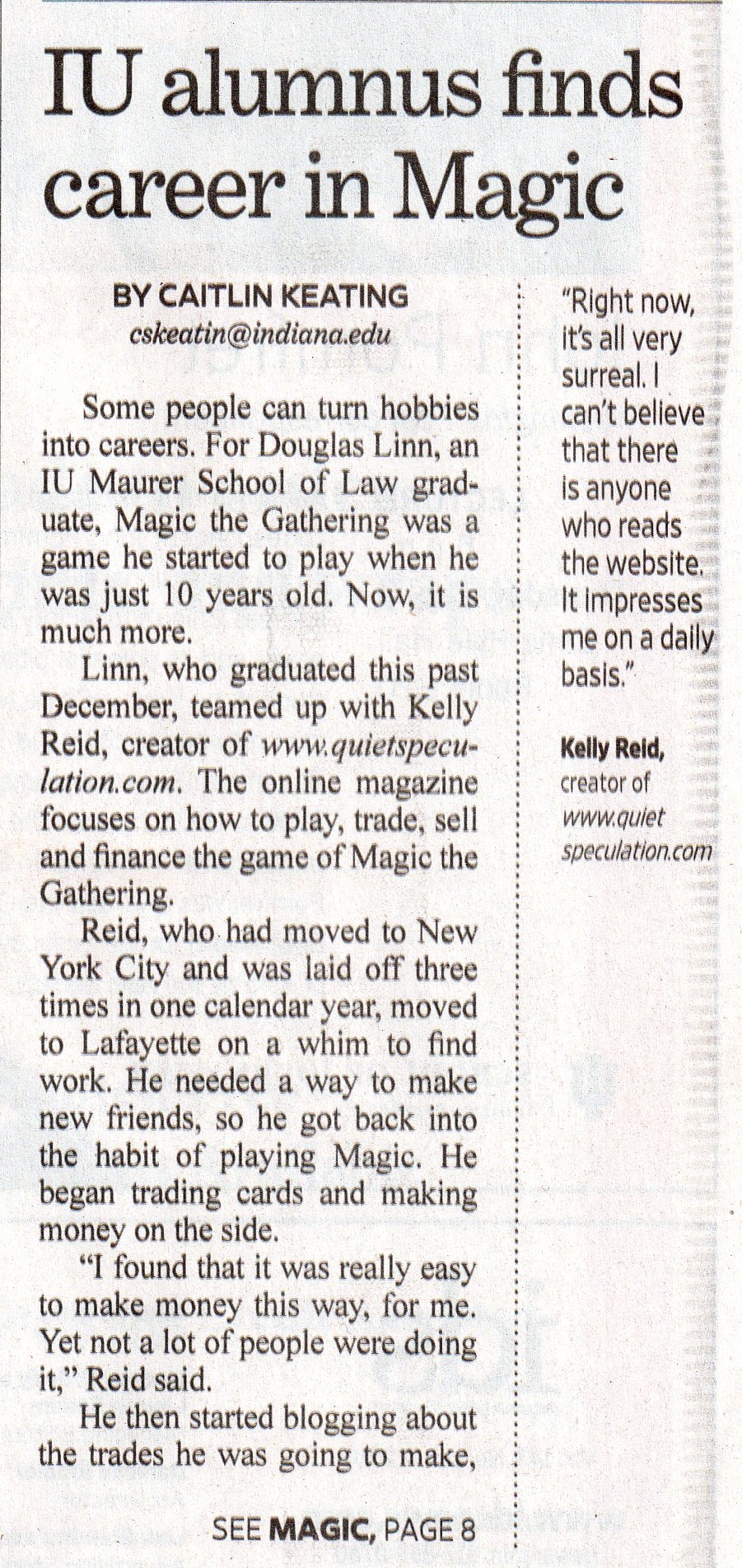 Hey Everyone, David, editor for the financial side of things, here! I know I don't show my face too much, but I wanted to share something with you all. I met Doug locally before starting working here, and because of that I get access to things such as Bloomington's Indiana Daily Student. It just so happens Mr. Doug Linn and Mr. Kelly Reid made it into the paper, so I thought I would share it with everyone. I know its not our typical article, but I thought it was quirky enough to be worth posting. Obviously this won't be part of the Insider tract, so everyone is free to get to know Doug and Kelly a bit more!