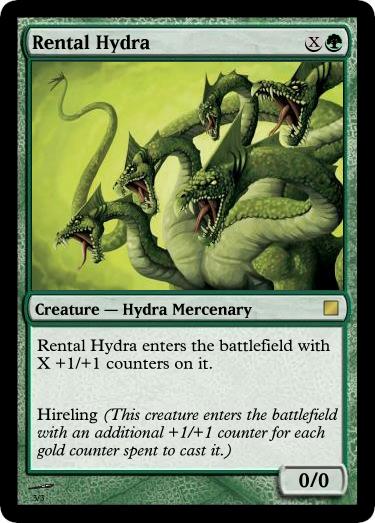 The Hirelings: Of course, what good is making money if there's no way to spend it. Seven of the decks beaters had the hireling ability, meaning you could make them bigger if you spent Gold to cast them. The Garden Guard was a 2/2 for two mana, which could become as big as a 4/4 if your coin purse was jangling. Scary Dude was a 1/1 for three mana, but carried the additional ability of intimidate. Finally, the Hired Killer was a 2/2 for four, and he had a very good incentive for using your hard-won gold: whenever the Hired Killer entered the battlefield, it would destroy target creature with power less than the Killer's. Dig deep for two Gold, and you could kill a 3/3 or less with it (remember, Gold only produced colourless mana, so the most you could spend on the Killer was two). Here too Devon had provided a best-in-breed in the form of the rare Rental Hydra. The Hydra was a hireling and cost one Green and X, entering the battlefield with X +1/+1 counters (like a Feral Hydra or Protean Hydra, but with hireling instead of their other special abilities).
