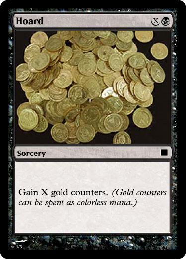 The Mechanic: Devon featured two mechanics in the deck, gold counters and hireling. Gold counters were an additional resource that could be accrued through several means in the game, and could be 'cashed in' for colourless mana at a 1:1 exhange rate (think 'Eldrazi Spawn tokens,' but without being creatures). At one time they could also be used to gain life, and while that eventually was cut they later gained the ability to used to cover life payments (for example, Sign in Blood). Hireling was a related ability meant to convey the influence of gold in a mercenary world. Creatures with the hireling keyword would come into play with an additional +1/+1 counter for each gold counter spent in casting them. Very clean and simple, we were excited at the premise and the possibilities it offered.