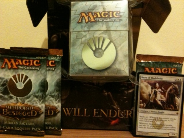 That's three Mirran faction packs, a foil prerelease promo Hero of Bladehold, an Ultra Pro deck box, and the limited edition faction card box released for the event.