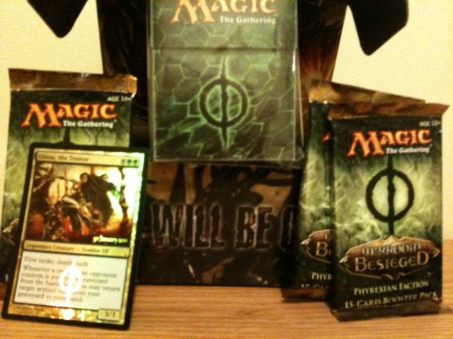 That's three Phyrexian faction packs, a foil prerelease promo Glissa, the Traitor, an Ultra Pro deck box, and the limited edition faction card box released for the event.