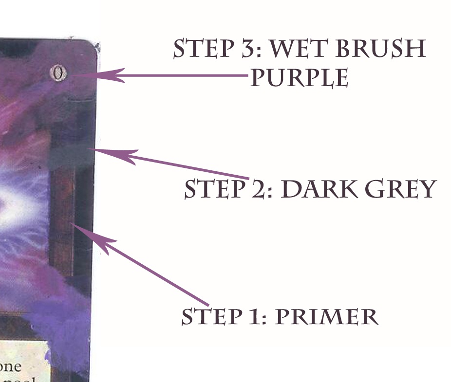 To begin with we start with an undercoating of a mixture between Naphthol Red and Ultramarine Blue. The general balance of the colors doesn’t matter as we just want to cover the original markings on the card, but a deep purple is desirable. The next step is tricky, but the result can be quite beautiful if done properly. The background of this card is layered, and so to match it, we must do some layering of our own. The first layer is the primer that we just laid down. For the second layer, we'll use a very dark gray mixture of Mars Black and a touch of Titanium White. The gray should be brushed on in and around the darker parts of the background. I chose to do mine almost in stripes radiating from the petal, but you may choose to do it in a different pattern. This is your chance to use your creativity to create something unique. Just be sure to pick out the name and casting cost so as not to lose them.