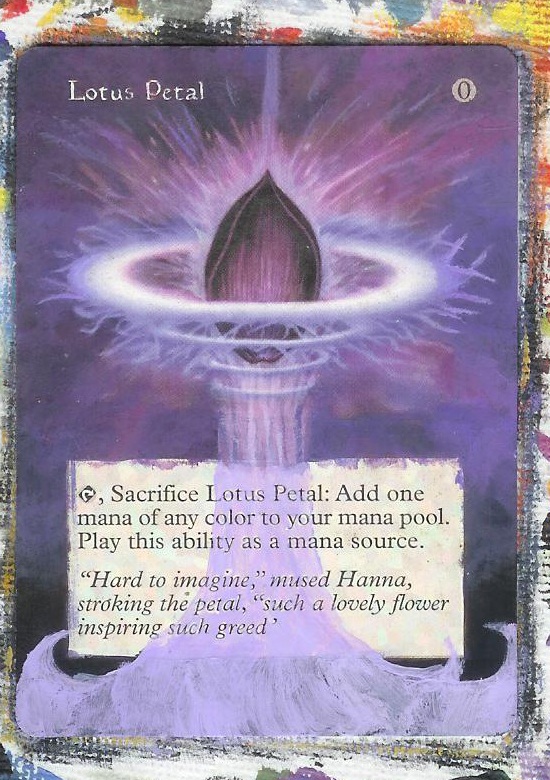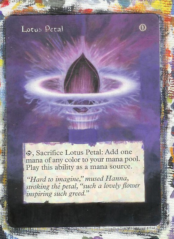 Lotus Petal is still an easy to pick up legacy staple. Earlier I stated that I'm not an economist, and so I don’t have a reason for this, but they are hanging around $4. These never stay in a binder for long either. Perhaps their best feature (for us) is the artwork. It's a very evocative picture, one that is fantastic in the literal sense of the word. Pictures like this allow us the inspiration to do more than just expand the borders of the artwork. With the fast pace that legacy cards are being scooped up, there is a huge demand for unique cards, be they foreign, foil, or altered. In other words, the legacy demand drives our prices up. The plan here is to take a $4 card and turn it into a $25 card, perhaps a Grim Monolith or a Mutavault.