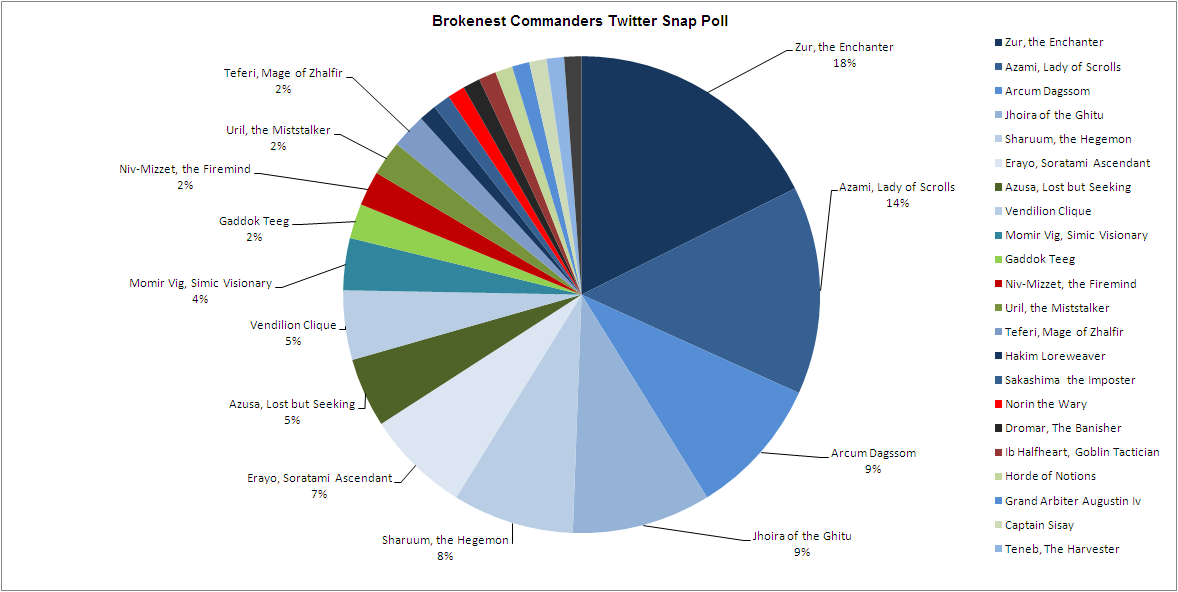 I held a brief, unscientific twitter poll the other day to get a quick consensus on what the most broken commanders are. Here are the results.