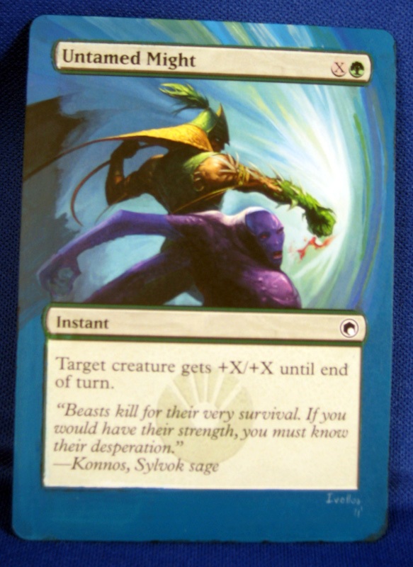 Before we begin today’s' project, I wanted to send a shout out to a reader. His name is Frank and he's been using the techniques he learned here to great effect. Aside from the the Untamed Might shown here, he also has altered a couple of Brainstorms which he has traded at $15 each. Let's break that down for a second. Frank took a $3 card, put an hour of work into it, and traded it for $15. That's $12 per hour, or a Scalding Tarn. Well done Frank!