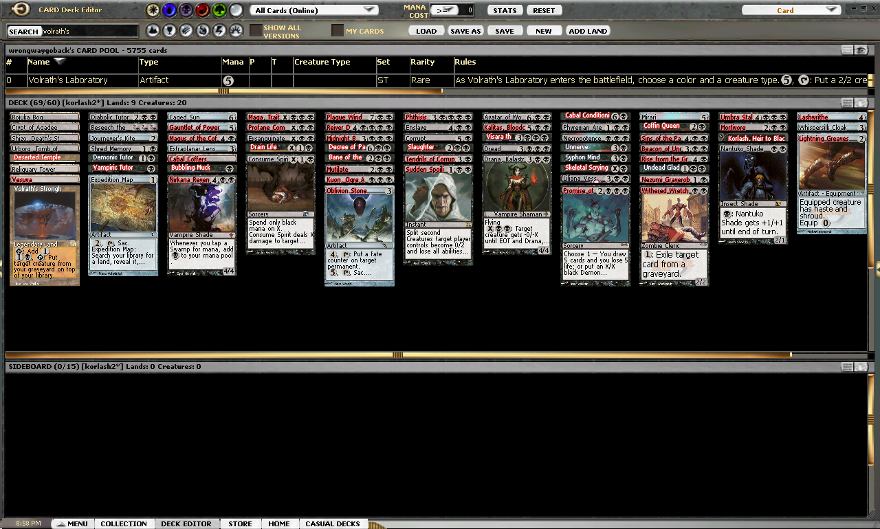 In this case Iāve sorted the functionality into utility lands, tutors, Cabal Coffers effects, Drain Life effects, mass removal, spot removal, creature-based removal (removal-on-a-stick), graveyard interaction, card advantage, buff creatures, and equipment. Black Market is "missing" as itās not on available on Magic Online.