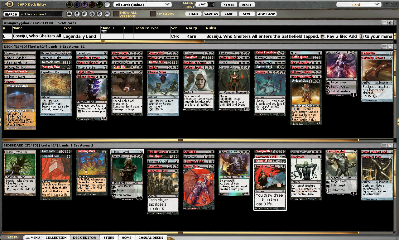 - Boseiju, Who Shelters All: The last thing this deck needs is to have its killer Exsanguinate countered. This helps get around that, and the life cost is marginal for this deck.