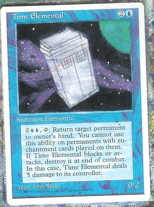 This week we will be working on an old and obsolete card, Time Elemental! I happen to think that the artwork for this card is rather mediocre as far as magic cards go, so I'll be replacing it with some fan art. Fan art is another great avenue to direct your painting talents down. These types of alters can be immensely popular with some people so it is a good skill to possess. For those of you who don’t know, fan art is the name for a piece of art that depicts a popular character or a pop culture reference, such as painting “The One Ring” on an Oblivion Ring or any of the basic lands with semi-nude anime girls that you can find on Ebay. After considering the card, I have decided that the name and even the abilities on the card lend themselves perfectly to a Doctor Who reference, so I'll be painting a TARDIS. For those of you who haven’t seen the show before, do yourselves a favor and watch it (Netflix has it online).
