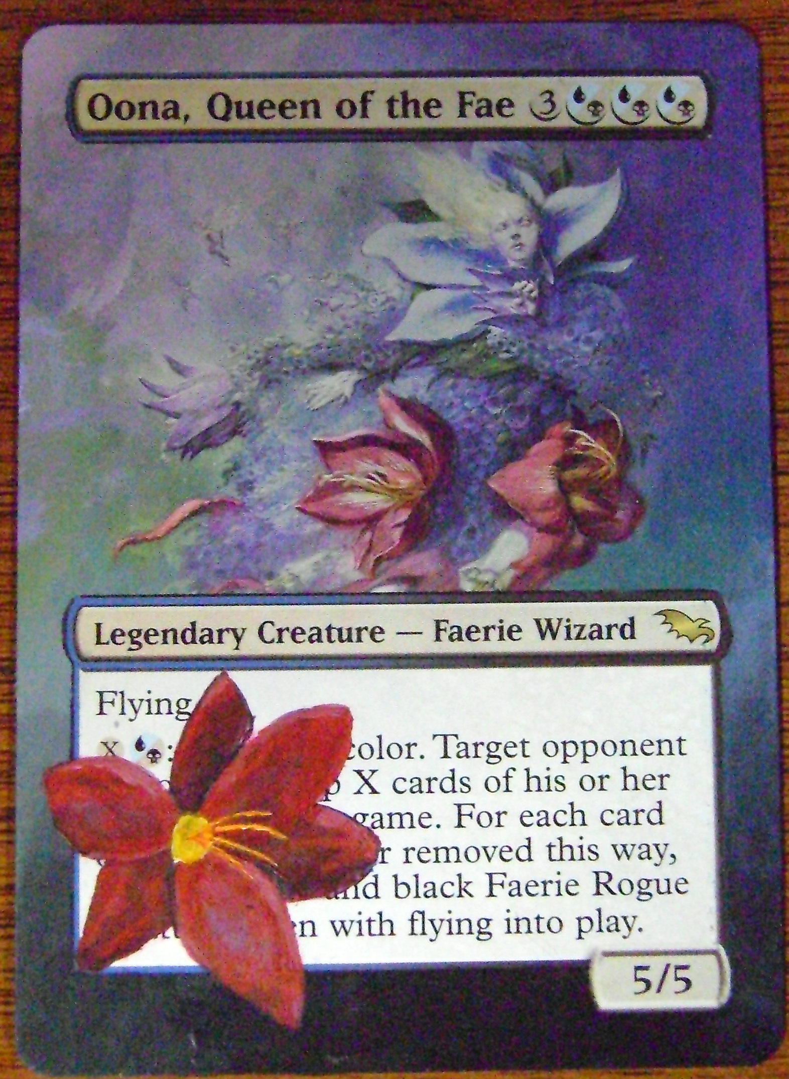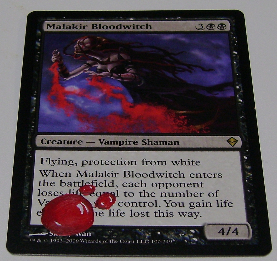 Accents do not need to be a continuation of the art though. You may use them to express your own separate ideas about the content. Droplets of blood on a vampire card is a decent use of the myths and legends that surround these creatures and ideas. I have seen more literal ideas used though, like painting a black lotus on to a Trinket Mage or even adding Progenitus to a Natural Order. The important thing to take away from this is to use your imagination, and not limit yourself to what the artist gives you.