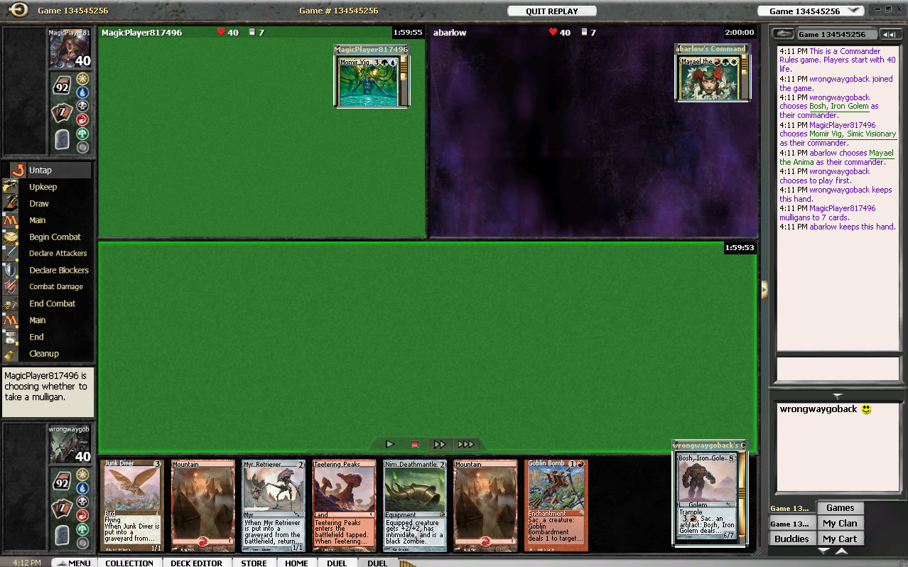 - The first game was against Momir Vig, Simic Visionary and Mayael the Anima.