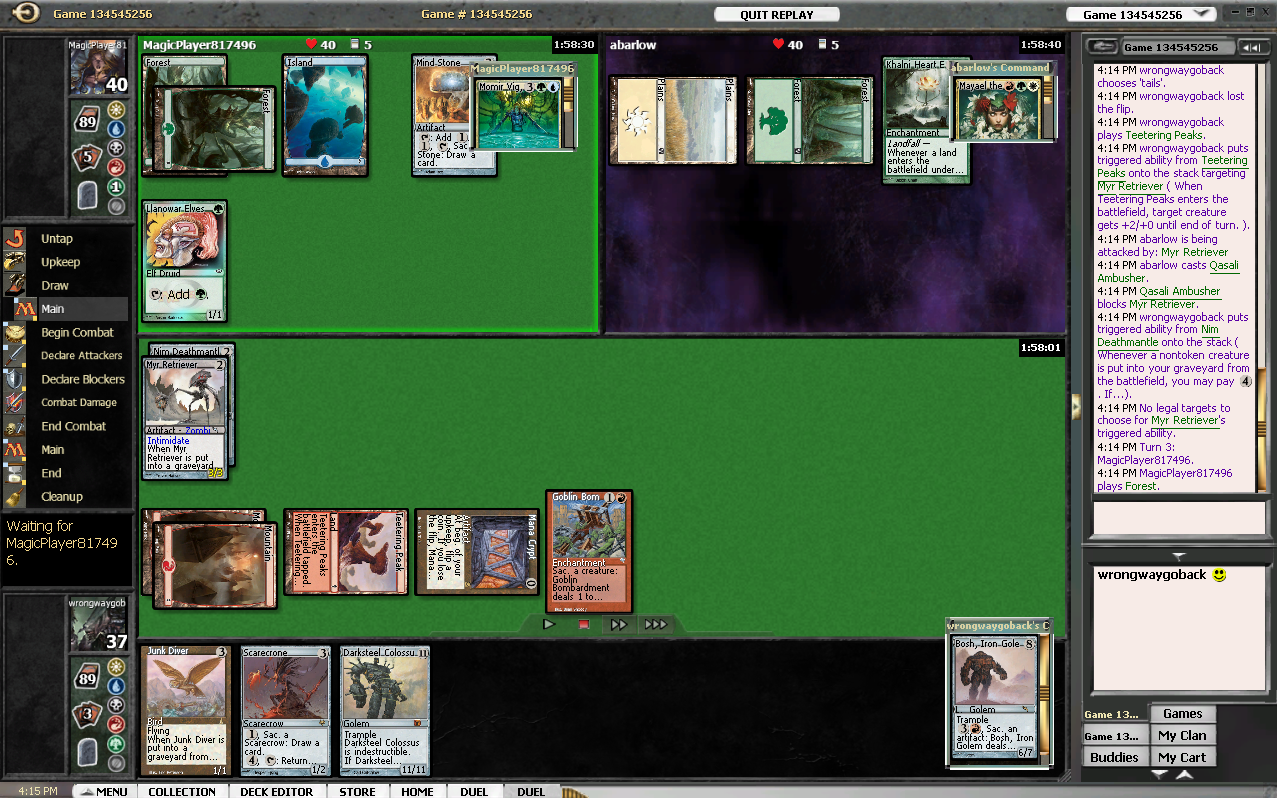 I had a great start with a small combo going on and playing the beatdown role, getting through for four a turn using a combination of Myr Retriever, Goblin Bombardment and Nim Deathmantle.