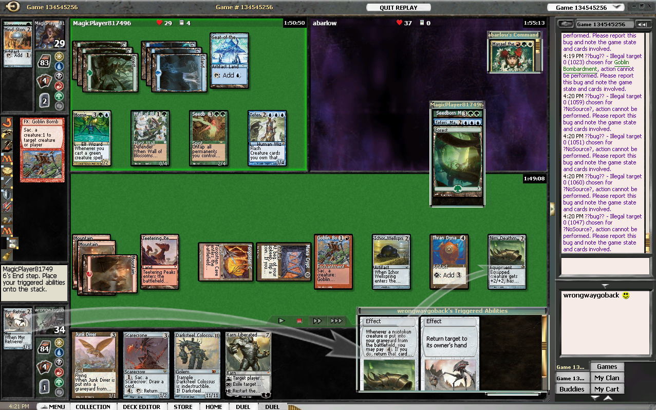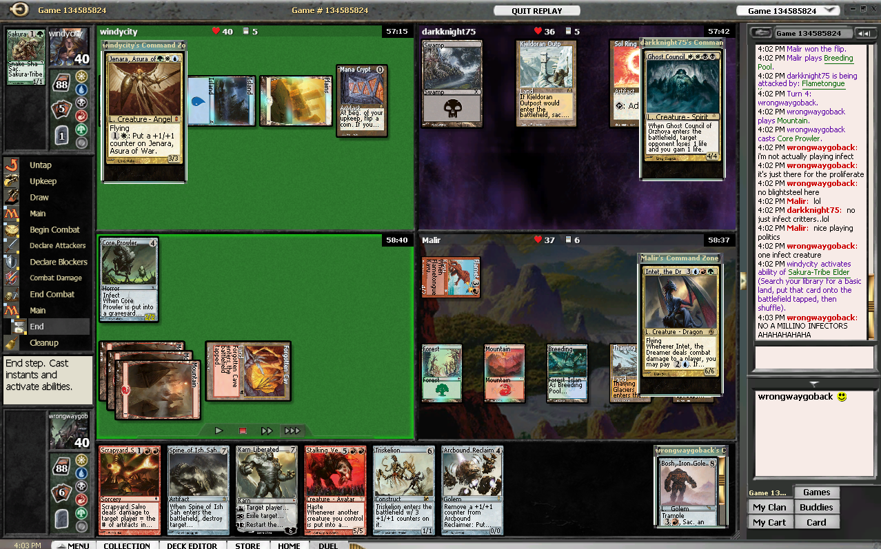 Unfortunately, my replay is corrupted from that point on but  it doesn't matter: the Intet player cheated out a Jin-Gitaxias, Core Auger, drew seven cards (filling up to 14), and left each us in turn without a hand. The game quickly ended from there. I guess there's not much you can do about that.
