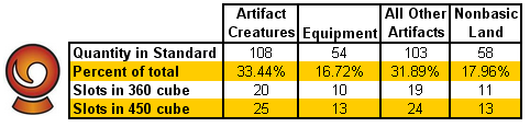 Nonbasics/Artifacts: We have an abundance here thanks to the back-to-back releases of Zendikar block and Scars block, so there should be little shortage when it comes to options. Since we want to keep the look and feel of Standard, we've broken down this class a little further to give you the 'right' number of artifact creatures and equipment.