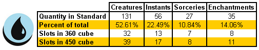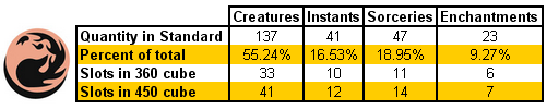 Building our first cube out of Standard also gives us another advantage: our structure is already in place right there in front of us. Advanced cubers often have a laundry list of considerations they have to take into account when designing their cube. For instance, is each color properly represented, in terms of its flavor or abilities? And is there the right balance of creatures and noncreatures? Luckily for us, Wizards has already done this with each set we'll be looking at. By looking at the numbers, we can create a very solid blueprint for what we need to build.