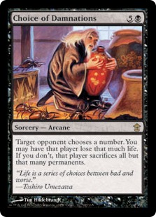 Magic has some pretty good “Solomon” cards, which ask the opponent to choose the lesser of two evils. Fact or Fiction is the best, but there are also Browbeat, Curse of Misfortunes and more. Choice of Damnations is a splendidly-designed card and is a fun one to play in Commander. I like that when you cast it, you have the ultimate decision on what you'd like to do. If the opponent selects a low number, you punish them on permanents. If they select a high one, you can ding them for their life. Remember that it tasks an opponent to sacrifice all but the nominated number of permanents – even token-spamming decks cannot get around this card.