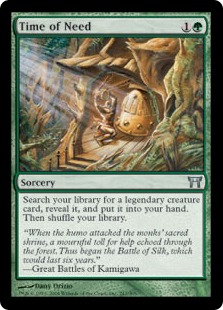 Time of Need is a surprisingly versatile tutor in Modern. In a G/W deck, it can get Kataki, War'sWage, Melira, Gaddock Teeg, Linvala, Keeper of Silence and more. It can grab Mangara of Corondor if you need to blow something up, for example. You can go get Yosei, the Morning Star to freeze the board and set up incredible lockdowns. A deck with Time of Need has a leaner curve; it is limited in its tutor targets, but it costs much less to get an effective impediment on the board.