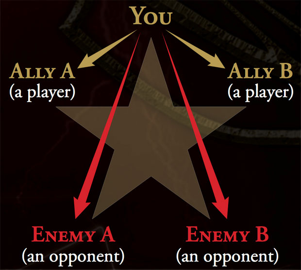 Next up is an oldie but goodie. Star is played with five people, and each player's goal is to eliminate the two players who aren't adjacent to them. Oftentimes Star is played with five mono colored decks so that each color has to oppose its enemies, but the political underpinnings of having to eliminate people without letting you 'allies' win stays intact without this extra level of organization. Star plays out very differently depending on the level of politicking that your friends engage in. In apolitical groups, Star is a great way to avert hurt feelings because who each person is supposed to go after is established at the start. In more underhanded settings, the format entails trying to snipe wins out from under 'allies' who have killed your mutual enemy. In this setting, Star plays very much like a control mirror of old. You aren't looking to throw out a bunch of strong plays, but rather to sneak something good enough through at some point by drawing attention elsewhere. Despite this sort of calculating play, Star goes a lot faster than a five player free-for-all because so many people are left alive at the end. Unfortunately, Star does little good in the realm of balance and can actually exacerbate the issue as often a powerful deck can kill off its enemies without the rest of the table's actions being relevant. On that note, I've never been a fan of Attack Left/Right. It brings the same balance issues as Star but without any of the political intrigue. What's more, in Commander limiting who you attack doesn't even make a huge game manageable since targeting often has more impact than attacking.
