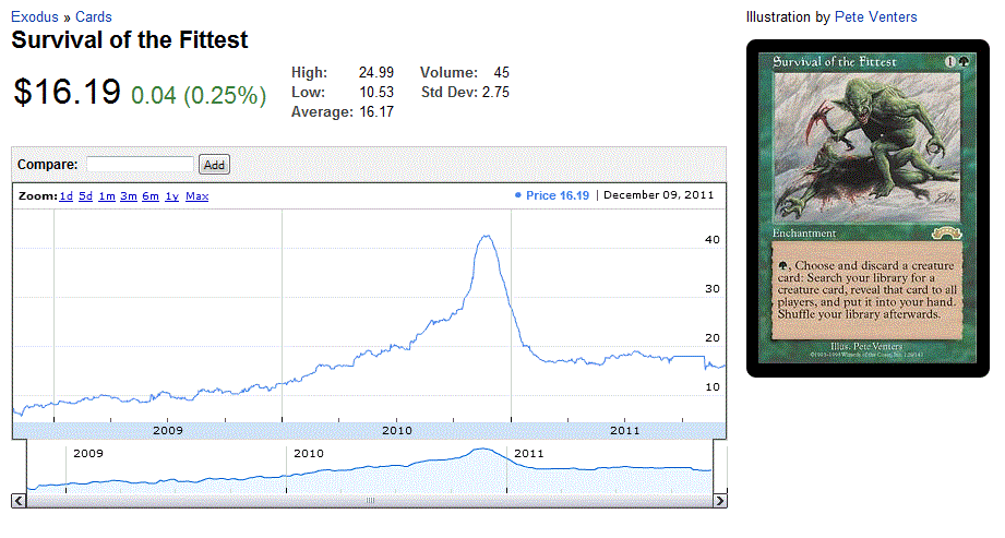 Some classic examples are the cards which become too powerful too quickly and are subsequently banned (or not). For example, Survival of the Fittest was a great speculation target at one point while its initial power was being harnessed (chart courtesy of blacklotusproject.com):