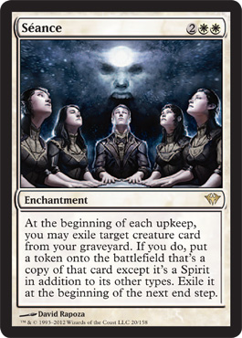 Next card on the list of spoilers is Seance, and, to be honest, I am a bit perplexed by it. I feel like Wizards forgot to add one line of text to the card: "that creature has haste". Sure, it's awesome that I can make tokens on my turn AND on your turn. My guy can even be a blocker for your attackers. But to never be able to attack with these tokens makes this card a little trickier to take advantage of.