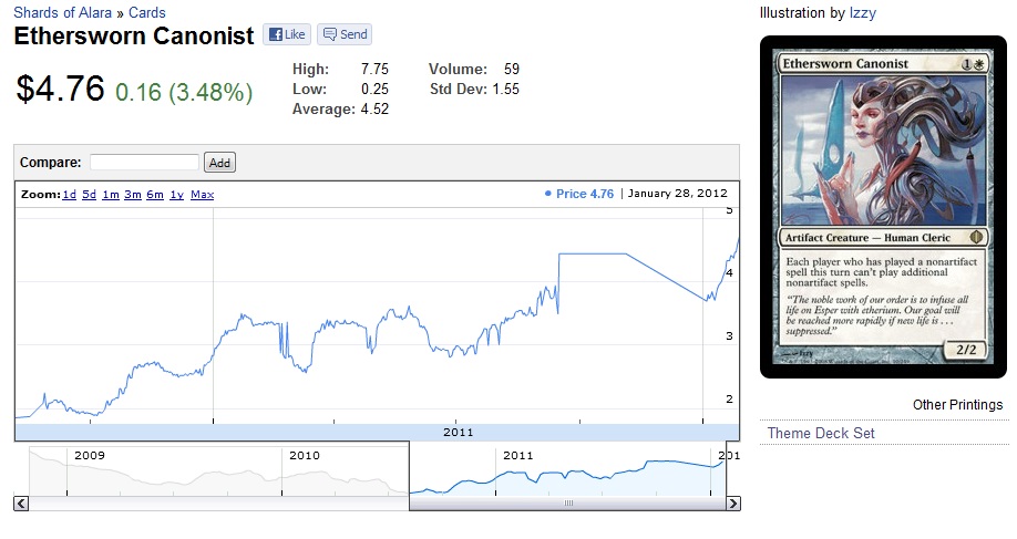 Hate Bears have always had an invisible price ceiling. The Canonist has been in this price range before, and so it is difficult to say if its momentum will take the card’s value to new heights. Star City Games seems to think so, as it is currently selling Ethersworn Canonist at $7! Certainly this is a Modern card worth watching.