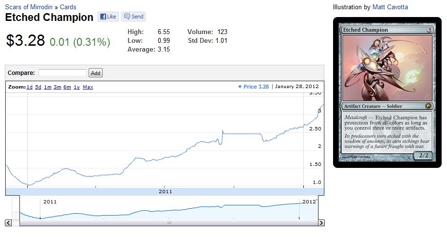 While I don’t expect you to find people who will trade Ravager at $15 so easily, there may be some other profitable Affinity cards. Consider, for example, Etched Champion (chart courtesy of blacklotusproject.com):