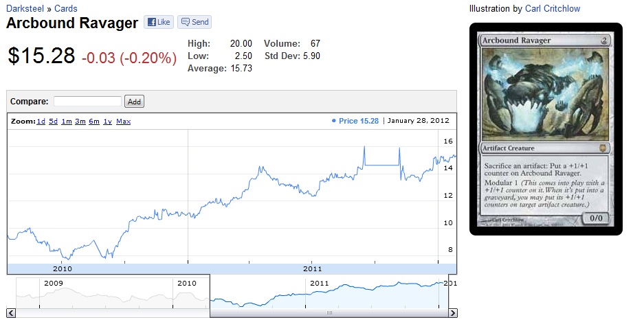 A quick look at the trend of Arcbound Ravager (chart courtesy of blacklotusproject.com) reveals just how lucrative Affinity cards have become. I remember enthusiastically selling my set of Arcbound Ravagers to Star City Games when they were buying them at $10 each. Months later, the buy price has not changed, but it is interesting to note that Star City Games has increased their sell price to $22 each!