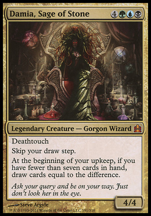 [card Damia, Sage of Stone]Damia's[/card] ability to fill your hand is obviously insane, but there is another line of text that you need to be mindful of. Skipping your draw step can be dangerous, since it makes it possible to get Damia-Locked in the event you have seven cards you can't do anything with.