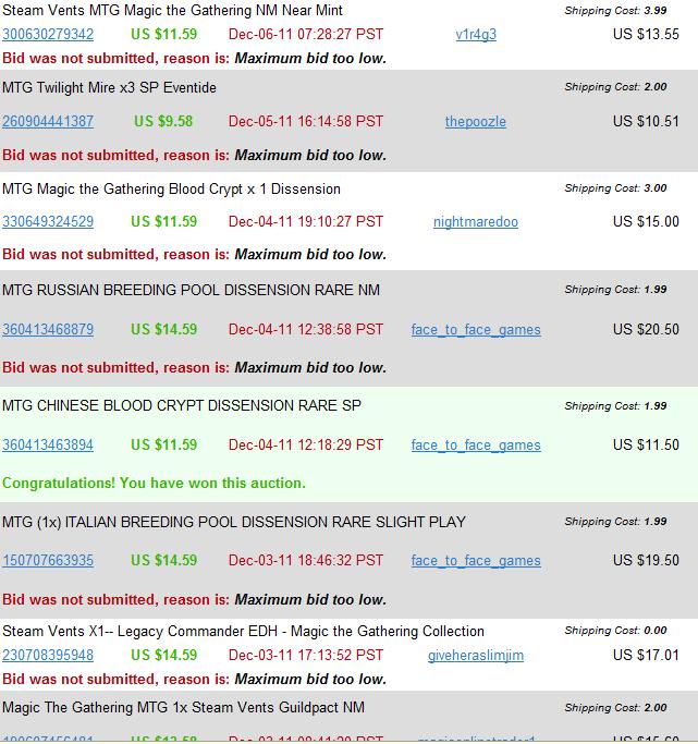 I used to do tons of this and made tremendous bank, but you have to keep an eye on the calendar and your Paypal balance. Since you're disconnected from the timing of the auction by the scheduler, it's easy to lose sight of the actual execution dates and chronology of your bids, which can be important if you place large bids and have a varying Paypal balance. Another thing the article didn't mention is that you actually have to pay for all the auctions you win! You can play the averages and make "margin" bets by bidding 3-5 times as much overall as you have to spend on cards, thinking you will surely not win that many auctions, but the market gets DRUNK sometimes. I once scheduled about 25 bids on cards at RIDICULOUSLY low prices, 20-30% of retail, planning to come back and reevaluate them a few days later and raise the bids on the cards I wanted most. I ended up forgetting to check back completely, much to my dismay since I won 15 of the auctions. I was thrilled to get the cards for those prices but not thrilled with the hit to my bankroll at that exact moment. So even though you can't and won't win all the auctions you schedule bids for, you do have to be prepared for the possibility that you will and be ready to cover bets.